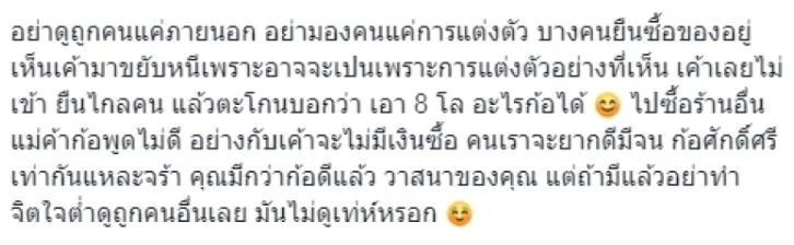 อย่าดูถูกคนแค่ภายนอก อย่ามองคนแค่การแต่งตัว บางคนยืนซื้อของอยู่ เห็นเค้ามาขยับหนีเพราะอาจจะเป็นเพราะการแต่งตัวอย่างที่เห็น เค้าเลยไม่เข้า ยืนไกลคน แล้วตะโกนบอกว่า เอา 8 โล อะไรก็ได้