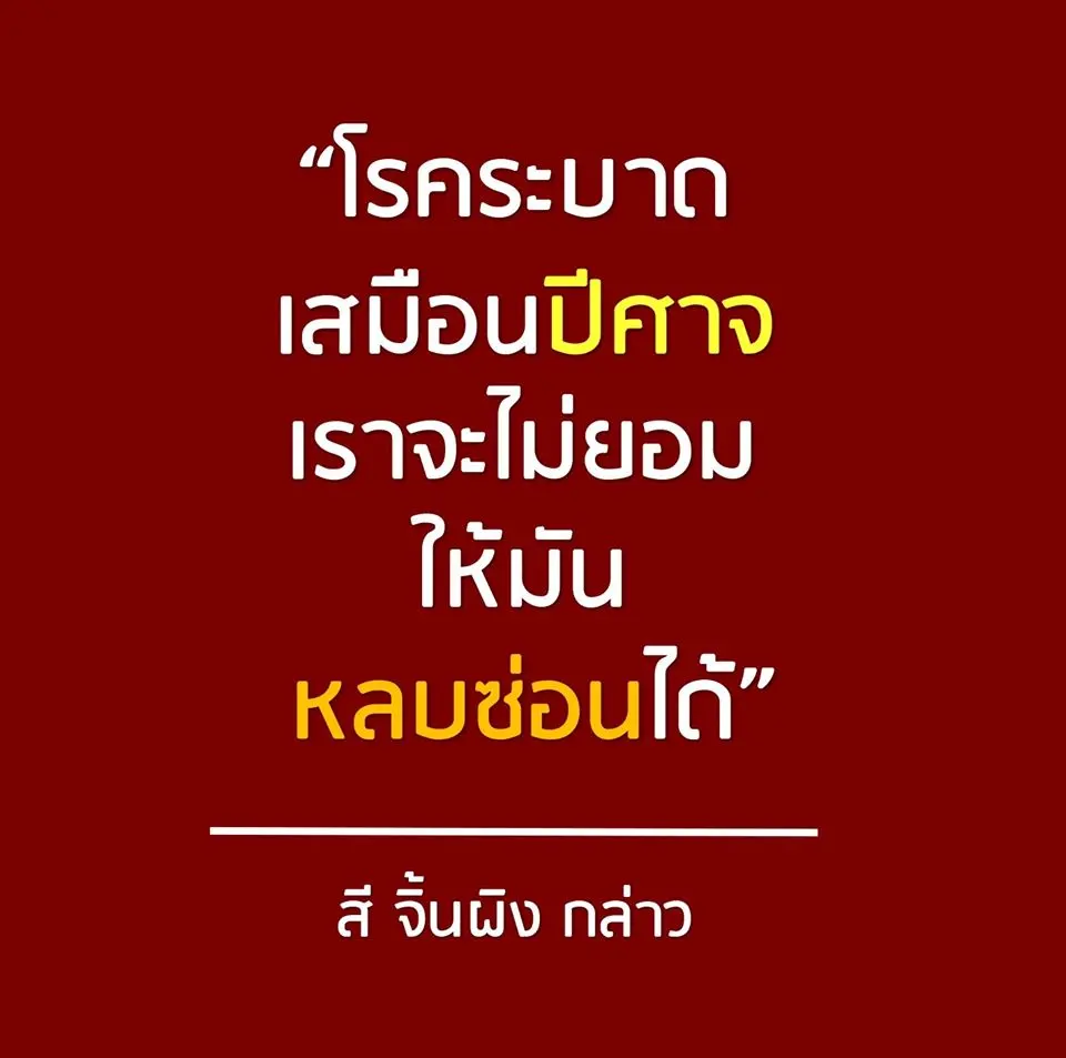 -"โรคระบาดเสมือนปีศาจ เราจะไม่ยอมให้มันหลบซ่อนได้ จึงสั่งการอย่างครอบคลุมและทั่วถึง เพื่อยับยั้ง ลดการแพร่ระบาดของโรค รวมถึงจัดตั้งคณะทำงานพิเศษเพื่อรับมือต่อสถานการณ์นี้แล้ว”
