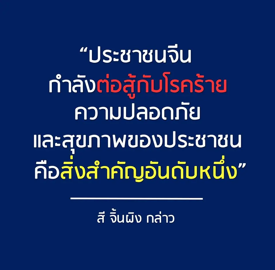 -"ประชาชนจีนกำลังต่อสู้กับโรคระบาด ดังนั้นความปลอดภัยและสุขภาพของประชาชนจึงเป็นสิ่งสำคัญอันดับหนึ่ง การป้องกันและการควบคุมโรคระบาดเป็นภารกิจที่สำคัญที่สุดของประเทศในเวลานี้"