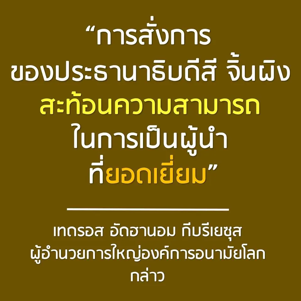 3.นายเทดรอส อัดฮานอม กีบรีเยซุส ผู้อำนวยการใหญ่องค์การอนามัยโลก กล่าวชื่นชมรัฐบาลจีนที่มีความแข็งแกร่ง รับมือกับการแพร่ระบาดของโรคอย่างมีประสิทธิภาพและทันท่วงที คำชี้แนะและการสั่งการของประธานาธิบดีสี จิ้นผิง สะท้อนความสามารถในการเป็นผู้นำที่ยอดเยี่ยม