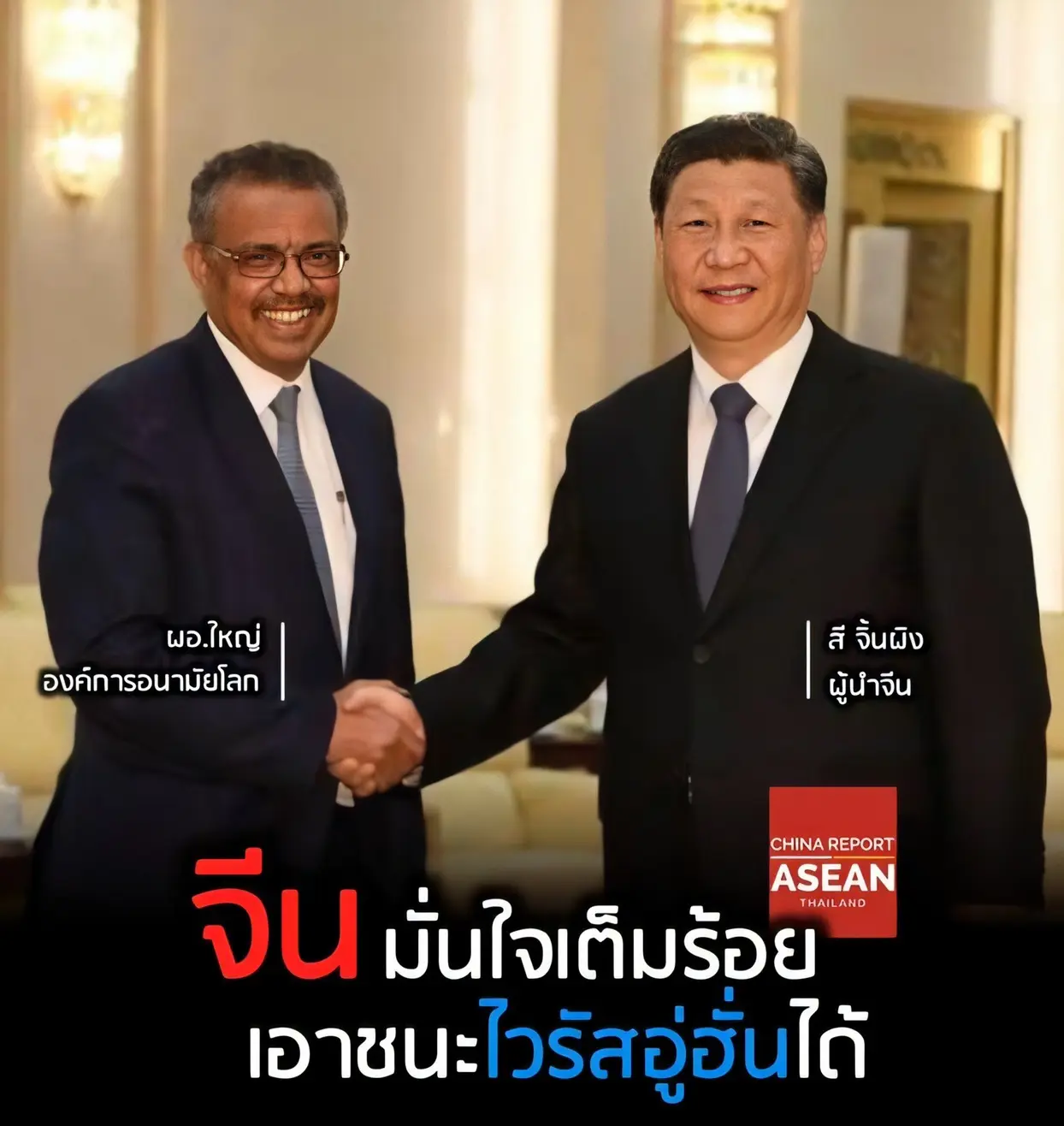 29 มกราคม 2563 เพจ China Report ASEAN - Thailand ได้โพสท์ถึงกรณีการพบกันของ สี จิ้นผิง ประธานาธิบดีจีน กับนายเทดรอส อัดฮานอม กีบรีเยซุส (Tedros Adhanom Ghebreyesus) ผู้อำนวยการใหญ่องค์การอนามัยโลก (WHO) โดยได้โพสท์ระบุว่า