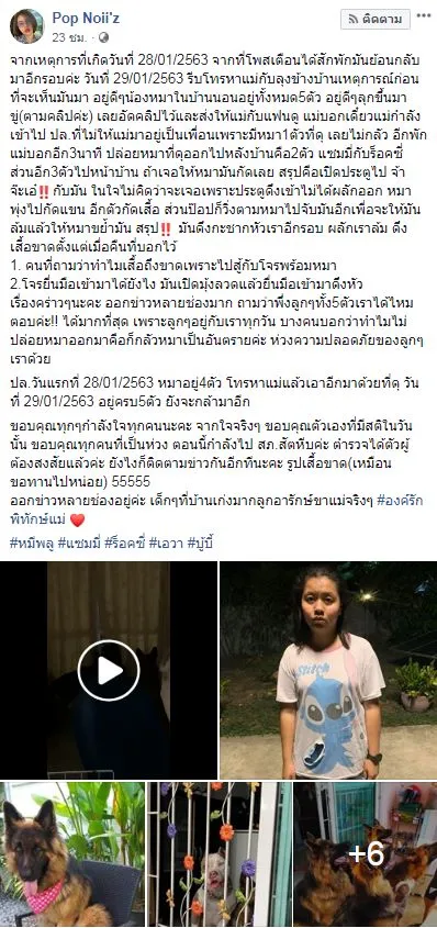 จากกรณีผู้ใช้เฟซบุ๊คชื่อ Pop Noii’z ได้โพสต์เล่าประสบการณ์ที่เธอถูกโจรบุกบ้านมาทำร้ายเธอ แต่เคราะห์ที่มีเจ้าสุนัขทั้ง 4 ช่วยเอาไว้ได้ ทั้งเห่า ทั้งขู่ และคอยไล่ จนโจรวิ่งหนีกระเจิง ซึ่งเธอเองได้เข้าแจ่้งความกับทางเจ้าหน้าทีตำรวจเรียบร้อยแล้ว แต่ยังไม่สามารถจับตัวคนร้ายได้ เนื่องจากยังไม่หลักฐานที่แน่นหนาพอ จากเหตุการณ์ดังกล่าวที่เกิดขึ้น ทำให้ชาวเน็ตบางส่วนเข้ามาแสดงความคิดเห็นเสียงแตก เนื่องจากข้องใจว่า โจรยื่นมือมาได้ยังไง,เปิดมุ้งลวดแล้วยื่นมือเข้ามาดึงหัว,ทำไมเสื้อถึงขาดเพราะไปสู้กับโจรพร้อมหมา เป็นต้น