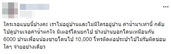 ผู้ใช้เฟซบุ๊กโพสต์ข้อความระบุว่า “ใครเจอแบบนี้บ้างคะ เราไม่อยู่บ้านและไม่มีใครอยู่บ้าน ค่าน้ำมาเท่านี้ กลับไปดูบ้านเจอค่าน้ำตกใจ มิเตอร์โดนยกไป ข้างบ้านบอกโดนเหมือนกัน 6000 บ้านเพื่อนน้องชายโดนไป 10,000 โทรติดต่อประปาไปไม่รับผิดชอบใดๆ จ่ายอย่างเดียว”