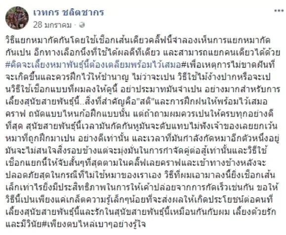 ผู้ใช้เฟซบุ๊กชื่อว่า เวทกร ชลิตชากร ได้มีการแชร์คลิปวิดีโอสาธิตวิธีแยกสุนัขกัดกันโดยใช้เชือกเส้นเดียว โดยได้ระบุข้อความทั้งหมดเอาไว้ว่า..