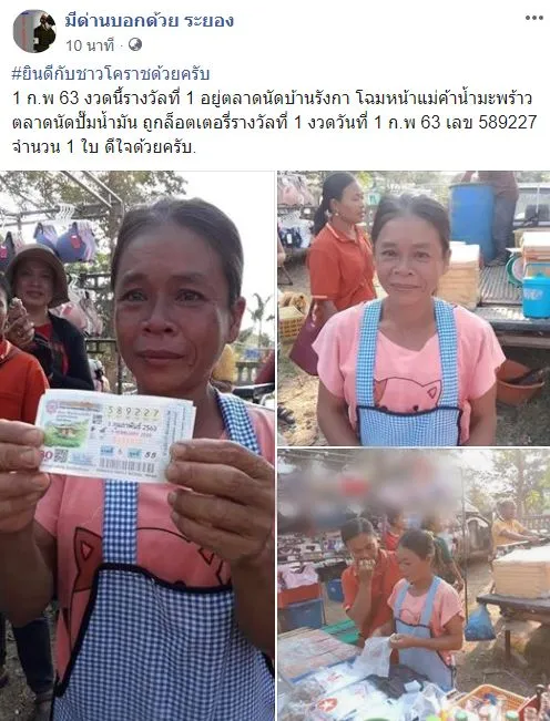 ทั้งนี้เพจมีด่านบอกด้วย ระยอง ได้ออกมาเผยภาพของสาวผู้โชคดีที่ได้รับรางวัลใหญ่ถูก ลอตเตอรี่รางวัลที่ 1 งวดวันที่ 1 ก.พ 63 เลข 589227 จำนวน 1 ใบ เป็นแม่ค้าอยู่ตลาดนัดบ้านรังกา โฉมหน้าแม่ค้าน้ำมะพร้าวตลาดนัดปั๊มน้ำมัน ขอแสดงความยินดีด้วยจ้า