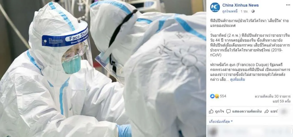 ล่าสุด เฟซบุ๊ก China Xinhua News ได้อัพเดตข่าวความคืบหน้าว่า “ฟิลิปปินส์รายงานผู้ป่วยไวรัสโคโรน่า ‘เสียชีวิต’ รายแรกของประเทศ วันอาทิตย์ (2 ก.พ.) ฟิลิปปินส์รายงานว่าชายชาวจีน วัย 44 ปี จากนครอู่ฮั่นของจีน ซึ่งเดินทางมายังฟิลิปปินส์เมื่อเดือนมกราคม เสียชีวิตแล้วด้วยอาการป่วยจากเชื้อไวรัสโคโรน่าสายพันธุ์ใหม่ (2019-nCoV)