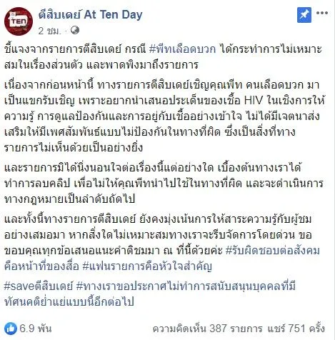 และทั้งนี้ทางรายการตีสิบเดย์ ยังคงมุ่งเน้นการให้สาระความรู้กับผู้ชมอย่างเสมอมา หากสิ่งใดไม่เหมาะสมทางเราจะรีบจัดการโดยด่วน ขอขอบคุณทุกข้อเสนอแนะคำติชมมา ณ ที่นี้ด้วยค่ะ #รับผิดชอบต่อสังคมคือหน้าที่ของสื่อ #แฟนรายการคือหัวใจสำคัญ#saveตีสิบเดย์ #ทางเราขอประกาศไม่ทำการสนับสนุนบุคคลที่มีทัศนคติย่ำแย่แบบนี้อีกต่อไป