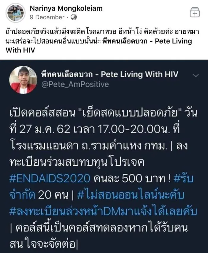 โดย พีท คนเลือดบวกได้โพสต์คล้ายกับรับสอนผู้คนทั่วไป ซึ่งเจ้าตัวระบุว่าเป็นคอร์สสอนการมีเพศสัมพันธ์แบบไม่ใช้ถุงยางอนามัย และ พีท ยังบอกอีกว่าปลอดภัย พร้อมทั้งรับเพียง 20 คน ซึ่งค่าเรียนคนละ 500 บาท และยังบอกอีกว่าคอร์สนี้เป้นคอร์สทดลองสำหรับผู้คนที่สนใจ หากมีคนสนใจเพิ่มเขาจะทำโปรเจคนี้ต่อ