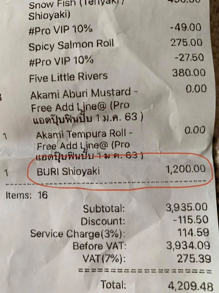 ปรากฏว่าเมนูนี้เสริฟช้ามากคือมาหลังจากอาหารจานอื่นทานไปหมดแล้ว สิ่งที่งงและเสียความรู้สึกที่สุดคือตอนเช็คบิลมา เจอราคาแก้มปลาบุรีย่างอยู่ที่ 1,200 บาท!!!!! ผมรีบถามพนักงานว่าราคานี้ผิดรึเปล่าครับ เพราะราคาที่โชว์อยู่มันแค่ 590 บาท พนักงานตอบกลับด้วยเหตุผลที่ไม่เป็นเหตุผมว่า ทางร้านเข้าใจว่าลูกค้าอยากได้แบบชิ้นใหญ่ เลยเสริฟแบบชิ้นใหญ่ราคา 1,200 บาทมาให้ ผมถามกลับว่าชิ้นใหญ่นี้และราคา 1,200 บาท มันระบุอยู่ในเมนูไม ทางร้านตอบผมว่าไม่มีคะ ผมก็ถามกลับว่าแล้วรู้ได้ยังไงว่าผมต้องการชิ้นใหญ่ในเมื่อผมก็สั้งอาหารมากมายและเมนูราคา 1,200 บาทนี้ก็ไม่มีให้ผมได้เห็น สุดท้ายทางร้านทำได้แค่ขอโทษแล้วบอกจะลดให้