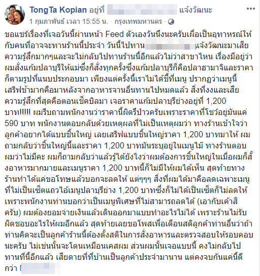 ผู้ใช้เฟซบุ๊กคุณ TongTa Kopian ซึ่งได้ออกมาแชร์เรื่องราวของร้านอาหารแห่งหนึ่งที่เจอมากับตัวระบุว่า…