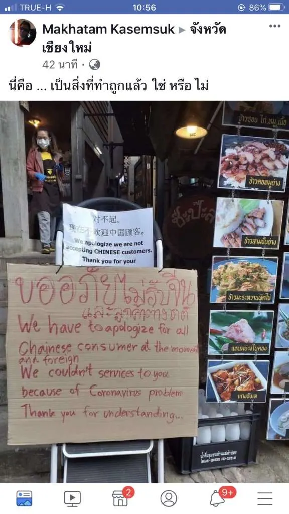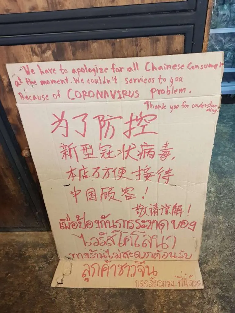 โดยผู้ใช้เฟซบุ๊กรายหนึ่งได้โพสต์ภาพที่ถ่ายจากหน้าร้านอาหารแห่งหนึ่งที่ขึ้นป้ายทั้งภาษาไทย รวมทั้งภาษาจีนและภาษาอังกฤษ ปฏิเสธที่จะรับลูกค้าชาวจีนและชาวต่างชาติเนื่องจากสถานการณ์การแพร่ระบาดของเชื้อไวรัสโคโรนาสายพันธุ์ใหม่ โดยป้ายดังกล่าวเขียนเป็นภาษไทยว่า “ขออภัยไม่รับจีนและลูกค้าต่างชาติ” ซึ่งโพสต์ดังกล่าวมีการแชร์ต่อเป็นจำนวนมากอย่างรวดเร็ว พร้อมเกิดกระแสวิพากษ์วิจารณ์อย่างกว้างขวาง ทั้งผู้ที่เห็นด้วยและไม่เห็นด้วย