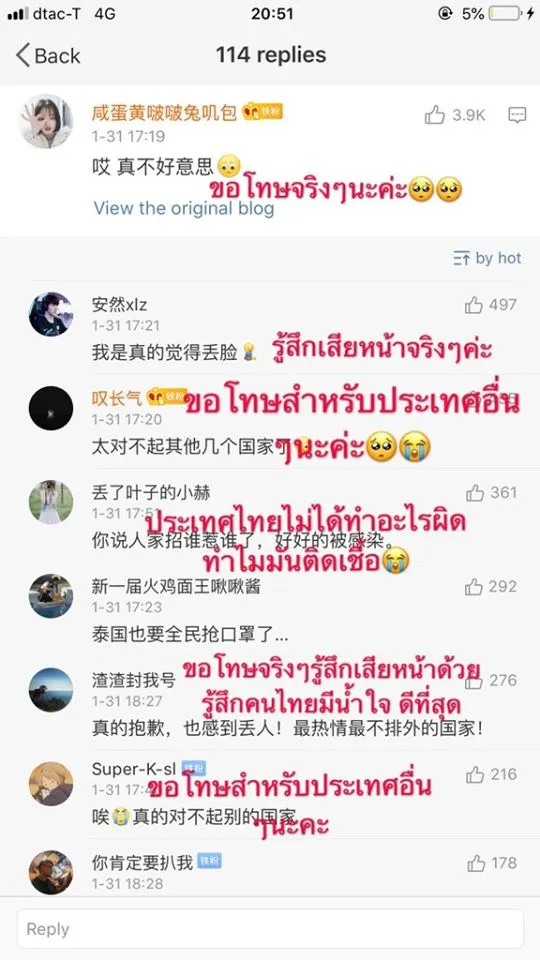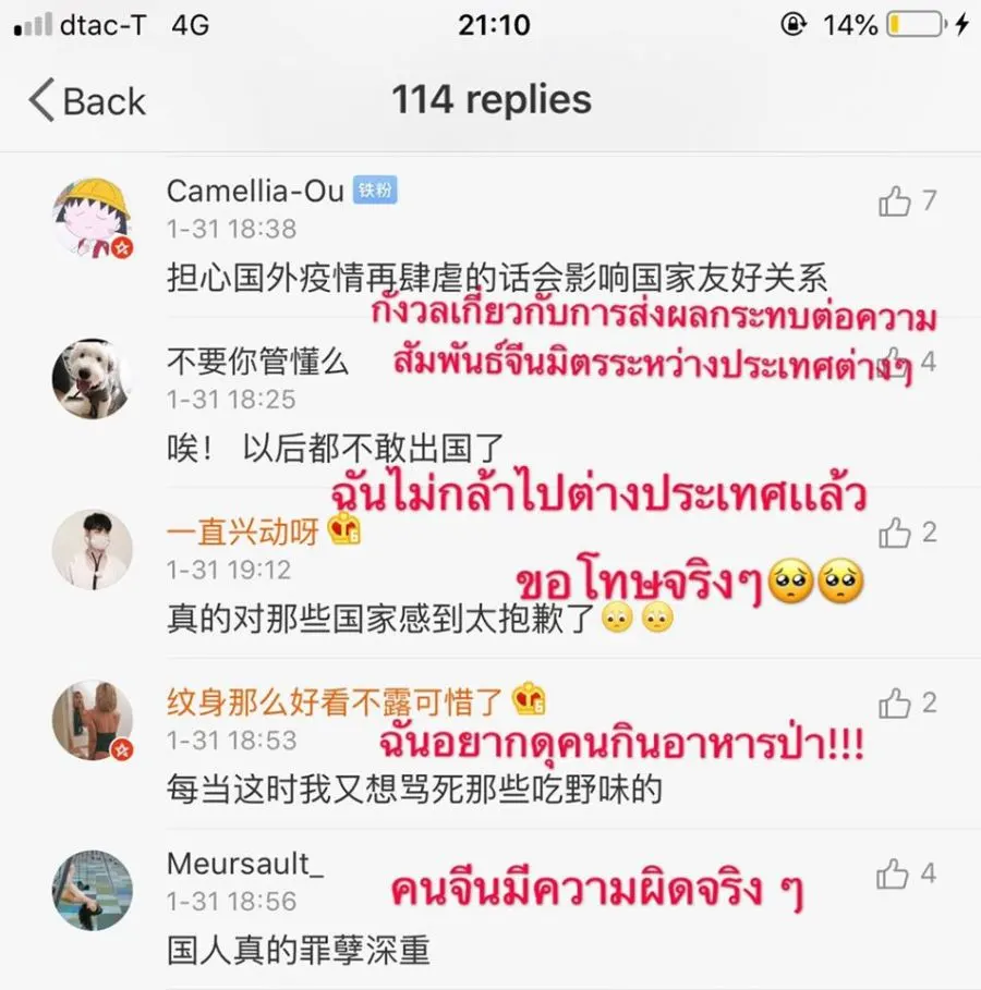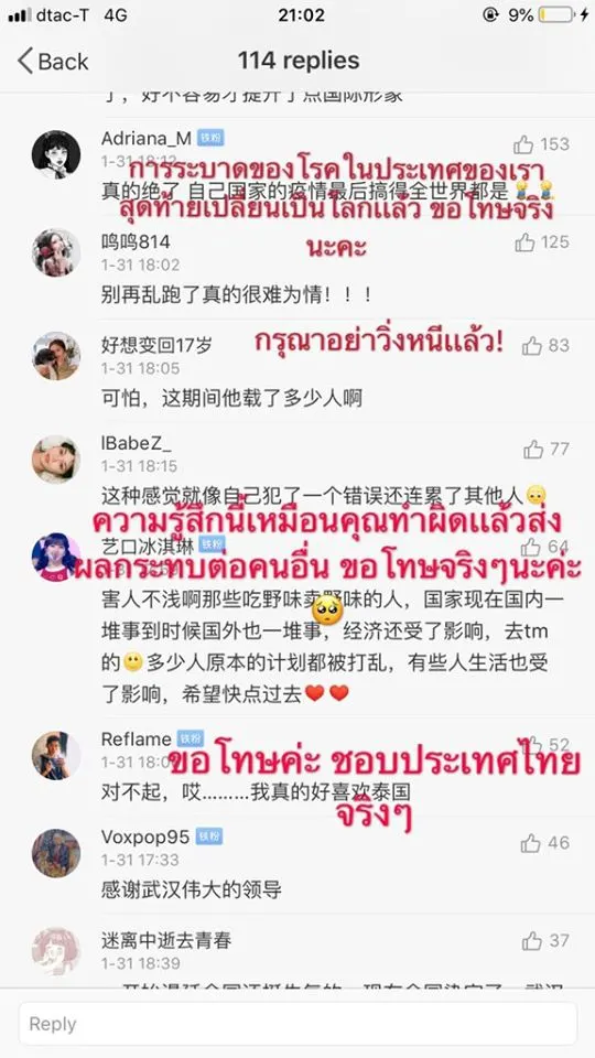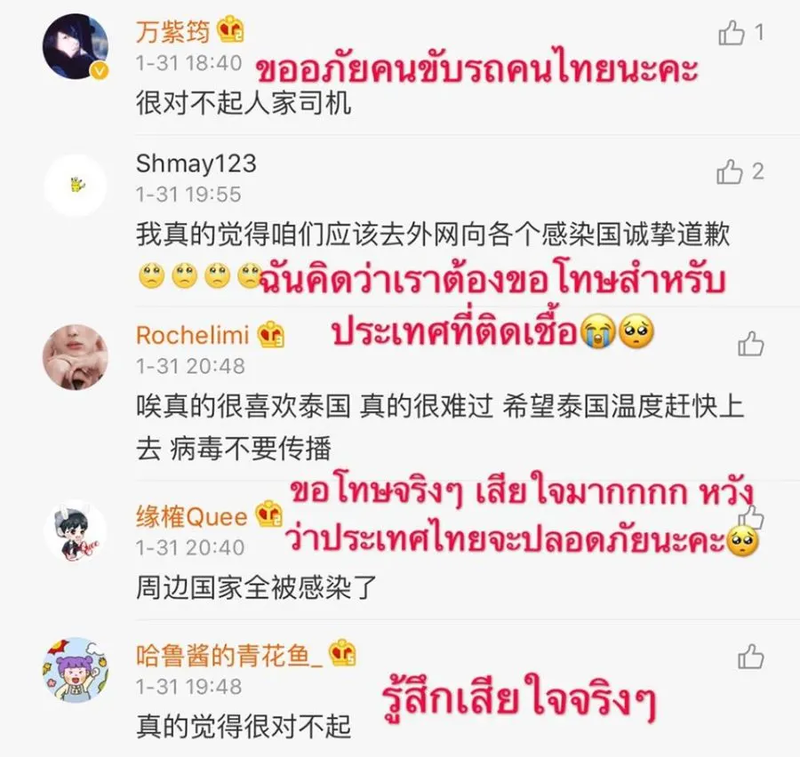 ล่าสุด ในโลกออนไลน์กลับมาสะพัดอีกระลอกกับเรื่องนี้ เนื่องจากชาวจีนได้คอมเม้นต์เกี่ยวกับเรื่องราวดังกล่าวอย่างมากมาย ซึ่งส่วนใหญ่เข้ามาขอโทษทั้งคนไทยและทั่วโลกสำหรับกรณีดังกล่าว บ้างก็เข้ามาคอมเม้นต์ว่า รู้สึกเสียหน้า และขอโทษด้วยจริงๆ รู้สึกว่าคนไทยมีน้ำใจ ดีที่สุด บ้างก็เข้ามาคอมเม้นต์ว่า ฉันคิดว่าเราต้องขอโทษสำหรับประเทศที่ติดเชื้อ