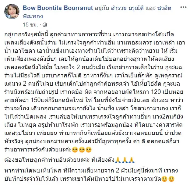 เจ้าของร้าน เล่าว่า ลูกค้าชายหญิงคู่นี้เข้ามากินที่ร้าน โดยเอารถมาจอดไว้ข้างกับโต๊ะ ก่อนจะเปิดเพลงในรถเสียงดังสนั่น ไม่เกรงใจลูกค้าคนอื่น นอกจากนี้ยังเอาเครื่องดื่ม ทั้งเหล้า โซดา เข้ามาเอง ทางร้านก็ไม่ได้ว่าอะไร แต่ผ่านไปสักพักเพลงก็ยังเสียงดัง จึงให้พนักงานไปบอกอย่างสุภาพว่าช่วยลดเสียง ทั้งคู่กลับไม่พอใจ ด่ากราดเด็กในร้านหยาบคาย บอกว่าลูกค้าคือพระเจ้า ซ้ำยังโวยที่ร้านคิดราคาอาหารผิดไป 30 บาท ซึ่งก็ได้แก้ไขทันทียังไม่ได้เก็บเงิน