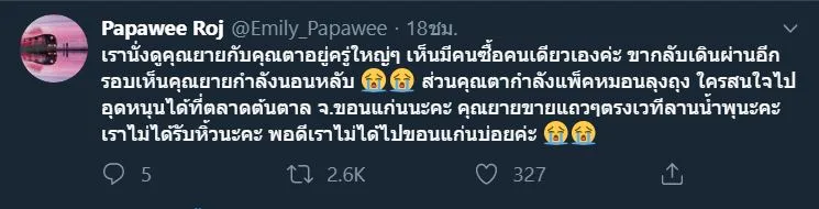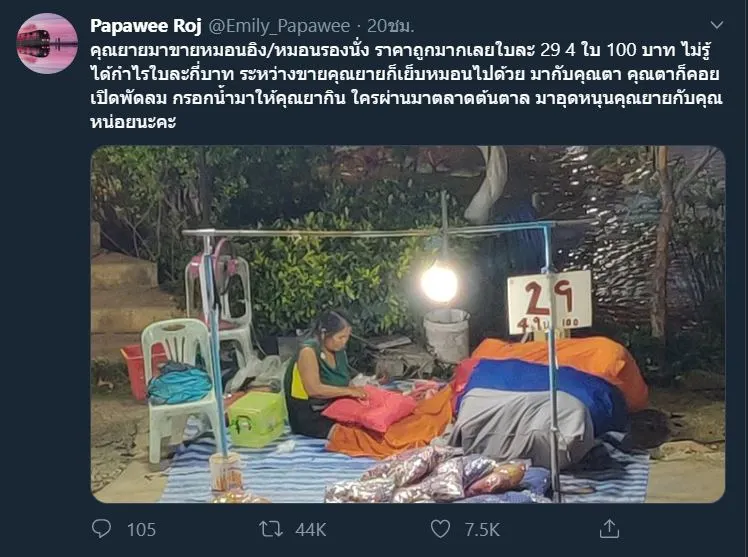 ภาพเหตุการณ์อันสุดซึ้งประทับใจ ที่ได้รับการเผยเเพร่ลงในโซเชี่ยล ผ่านทางบัญชีผู้ใช้ทวิตเตอร์ Emily_Papawee หลังจากที่ได้ไปเดินยังตลาดต้นตาล จังหวัดขอนเเเก่น เเละเจอคุณยายท่านหนึ่ง มานั่งขายหมอนอิง หมอนรองนั่ง ราคาถูกมาก