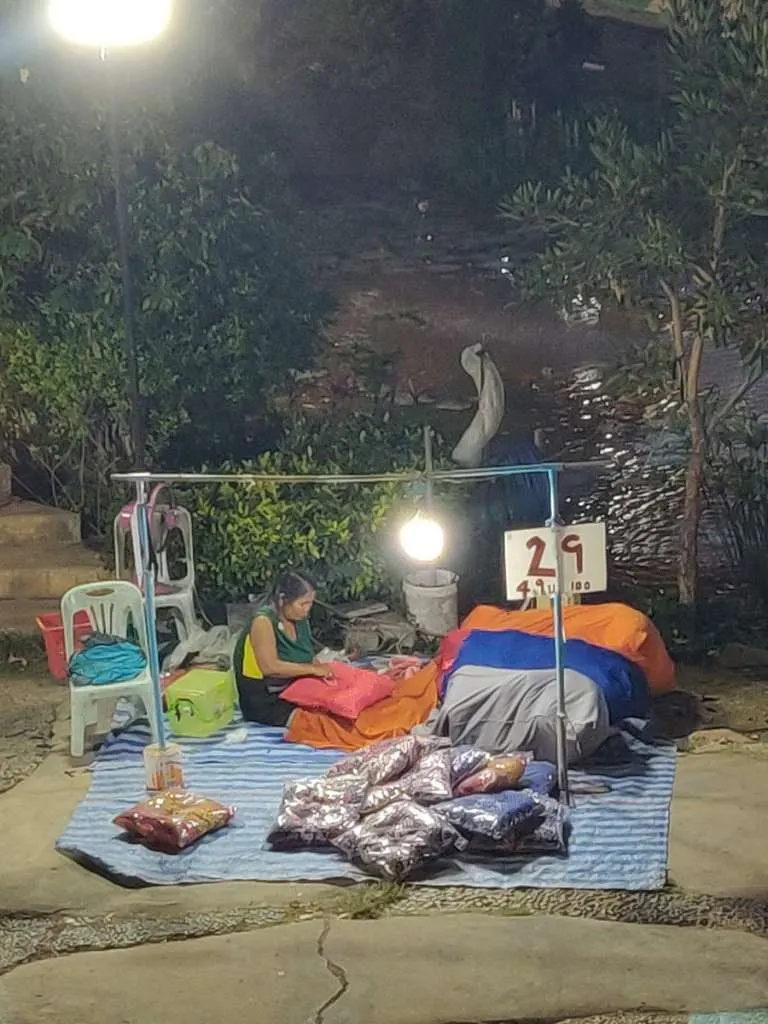 คุณยายมาขายหมอนอิง หมอนรองนั่ง ราคาถูกมากเลยใบละ 29 4 ใบ 100 บาท ไม่รู้ได้กำไรใบละกี่บาท ระหว่างขายคุณยายก็เย็บหมอนไปด้วย มากับคุณตา คุณตาก็คอยเปิดพัดลม กรอกน้ำมาให้คุณยากิน ใครผ่านมาตลาดต้นตาล มาอุดหนุนคุณยายกับคุณหน่อยนะคะ