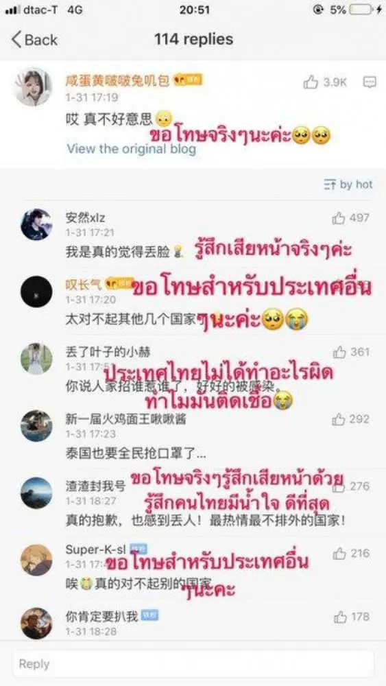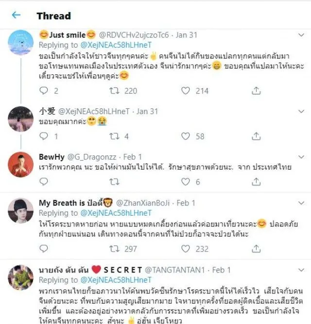 อย่างไรก็ตาม มีคนไทยจำนวนมาก ได้เข้าไปตอบข้อความดังกล่าวของสาวจีนใจไทยคนนี้ ระบุว่า เรื่องนี้ไม่มีใครอยากให้เกิดขึ้น คนไทยเองก็ไม่ได้ไม่ชอบคนจีน เพียงต้องการป้องกันตัวเองเท่านั้น ขอให้ชาวจีนกลับมาเที่ยวเมืองไทยอีกครั้ง