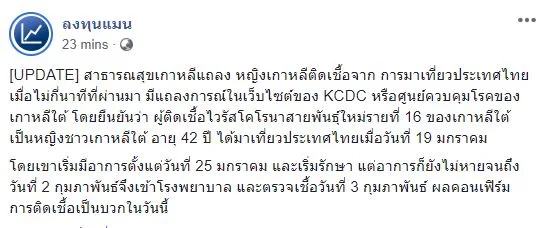 ล่าสุดเพจลงทุนแมน ได้ออกมาโพสต์อัพเดทว่า สาธารณสุขเกาหลีแถลง หญิงเกาหลีติดเชื้อจาก การมาเที่ยวประเทศไทย