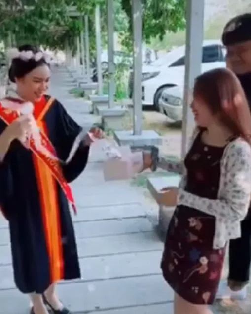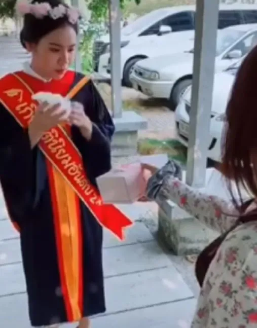 ผู้ใช้เฟซบุ๊ก เตรียมสอบบรรจุครู by ยอด ได้เผยแพร่คลิปวิดีโอของบัณฑิตสาวที่รับปริญญา โดยมีพี่สาวนำกล่องกระดาษทิชชู่มาให้ซับเหงื่อ แต่พอดีดึงออกมากลายเป็นว่า ในกล่องนั้นมีเงินเป็นจำนวนมาก จึงได้รู้ทันทีเลยว่า นี่คือของขวัญวันรับปริญญา