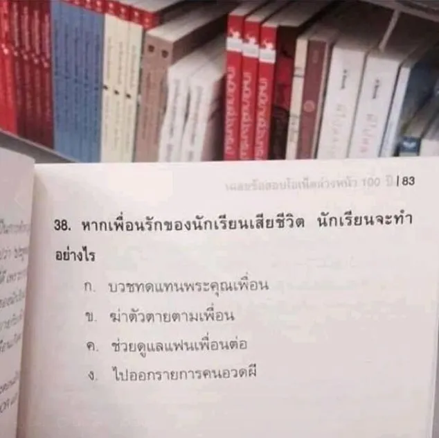 กลายเป็นภาพสุดฮาที่ชาวเน็ตเข้ามาแชร์กันเป็นจำนวนมาก จากกรณีเพจเฟซบุ๊ก แชร์ภาพนี้โดยไม่มีเหตุผล โพสต์ภาพแนวข้อสอบ O-NET ของเด็กนักเรียนที่มีโจทย์คำถามข้อ 38. ระบุว่า “หากเพื่อนรักของนักเรียนเสียชีวิต นักเรียนจะทำอย่างไร”