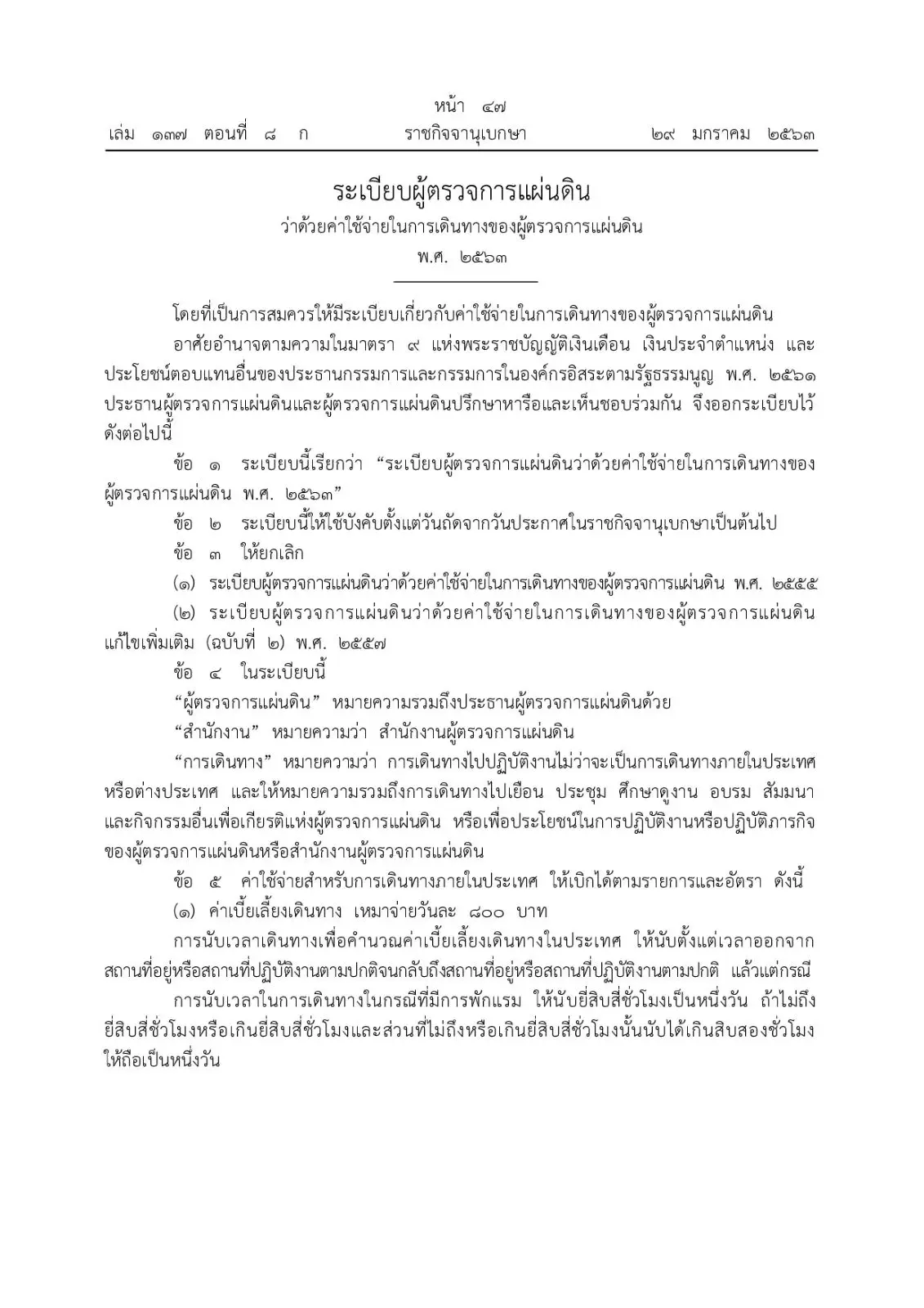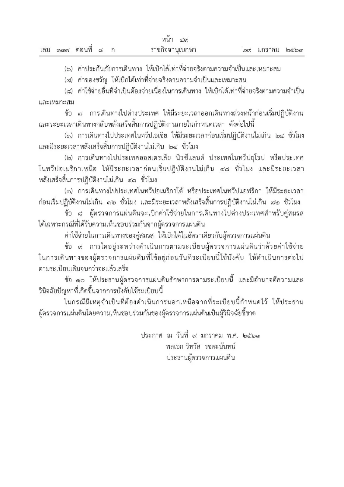 ได้ประกาศในพระราชกิจจานุเบกษา หน้าที่ 47-49 เล่มที่ 137 ตอนที่ 8 ก ประกาศ ณ วันที่ 29 มกราคม 2563 ระเบียบผู้ตรวจการแผ่นดินว่าด้วยเรื่องค่าใช้จ่ายในการเดินทางของผู้ตรวจการแผ่นดิน พ.ศ. 2563 ลงนามโดยพลเอกวิทวัส รชตะนันท์ ประธานผู้ตรวจการแผ่นดิน ลงวันที่ 9 มกราคม 2563