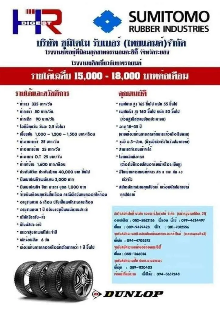 เชื่อว่าหลายๆคนที่ตกงาน หรือพึ่งเรียนจบใหม่ และกำลังมองหางานทำอยู่ ต้องบอกเลยว่าโอกาสนั้นมาถึงแล้ว เมื่อทางด้านบริษัท ซูมิโตโม รับเบอร์ ไทยแลนด์ จำกัด โรงงานผลิตเกี่ยวกับยางรถยนต์ ซึ่งตั้งอยู่ที่นิคมอุตสาหกรรมอมตะซิตี้ จังหวัดระยอง รับสมัครพนักงานโดยมีรายละเอียดดังนี้