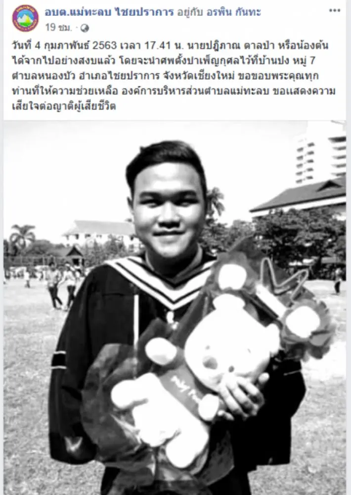 วันที่ 5 กุมภาพันธ์ 2563 ผู้สื่อข่าวสยามนิวส์รายงานว่า โลกออนไลน์มีการแชร์เรื่องราวของผู้ใช้เพจเฟซบุ๊กชื่อ อบต แม่ทะลบ ไชยปราการ ซึ่งได้ดพสต์ภาพของชายคนหนึ่งพร้อมระบุข้อความว่า วันที่ 4 กุมภาพันธ์ 2563 เวลา 17 41 น นายปฎิภาณ ตาลป่า หรือน้องต้น ได้จากไปอย่างสงบแล้ว โดยจะนำศพตั้งบำเพ็ญกุศลไว้ที่บ้านปง หมู่ 7 ตำบลหนองบัว อำเภอไชยปราการ จังหวัดเชียงใหม่ ขอขอบพระคุณทุกท่านที่ให้ความช่วยเหลือ องค์การบริหารส่วนตำบลแม่ทะลบ ขอเเสดงความเสียใจต่อญาติผู้เสียชีวิต