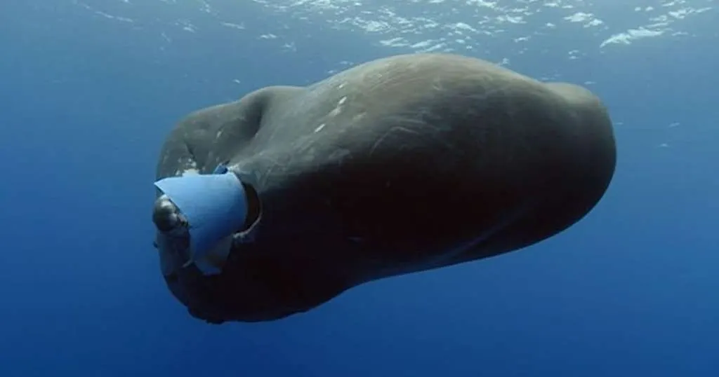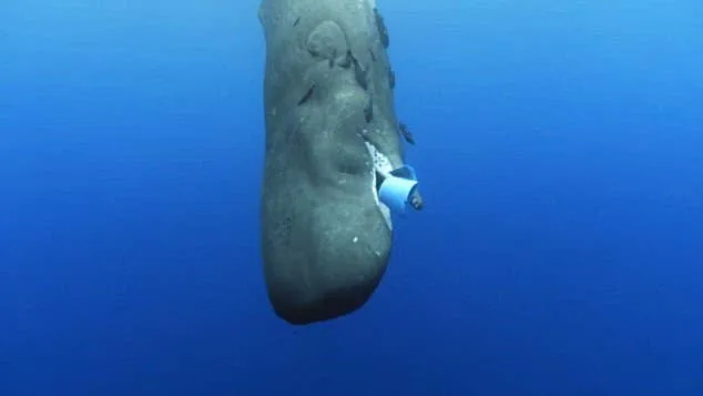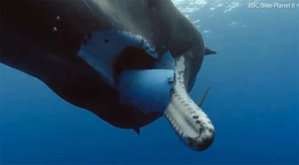 ตากล้องของบีบีซีที่ดำน้ำถ่ายทำสารคดี ต้อง(ฝ่ากฎ) เข้าไปช่วยดึงกระป๋องพลาสติกสีฟ้าออกจากปากวาฬสเปิร์มหรือวาฬหัวทุยอายุน้อยตัวนี้..ที่พยายามกินกระป๋องพลาสติกพบลอยอยู่ในทะเล