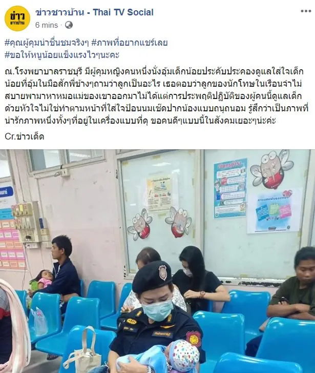 ผู้คุมน่าชื่นชมจริงๆ ภาพที่อยากแชร์เลยขอให้หนูน้อยแข็งแรงไวๆนะคะ ณ โรงพยาบาลราชบุรี มีผู้คุมหญิงคนหนึ่งนั่งอุ้มเด็กน้อยประคับประคองดูแลใส่ใจเด็กน้อยที่อุ้มในมือ สักพักพี่ข้างๆถามว่าลูกเป็นอะไร