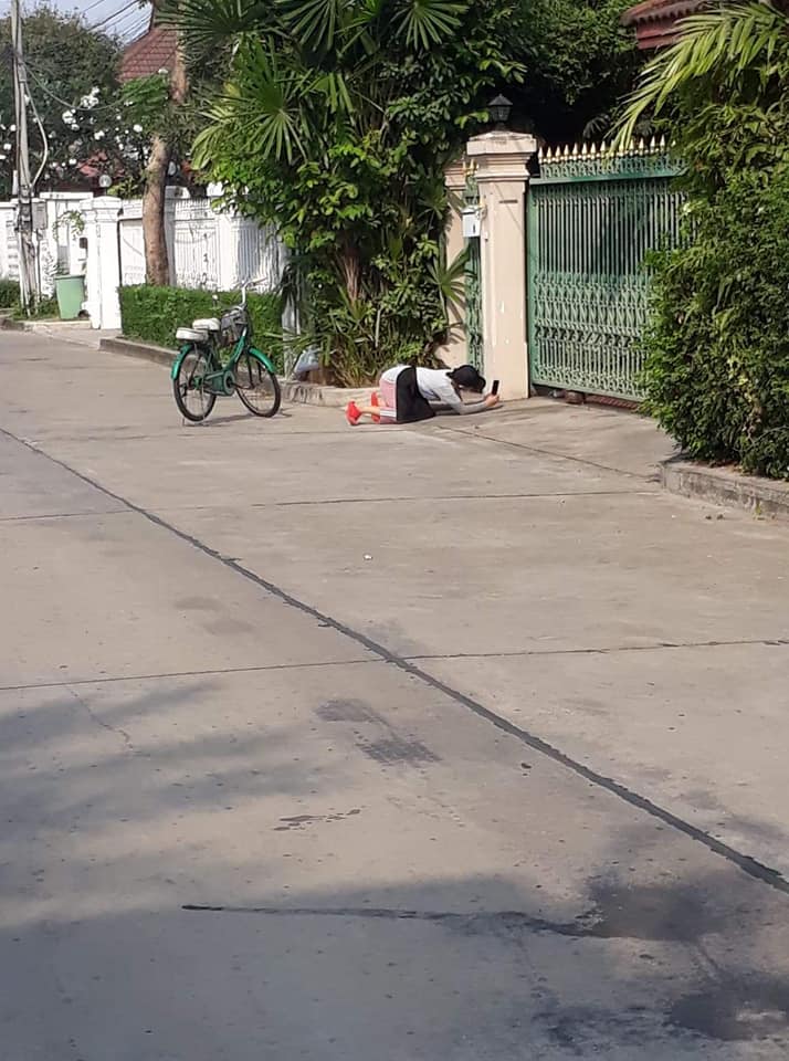 เฟซบุ๊ก จิตรลดา คำเกษ โพสต์เล่าเหตุการณ์ขณะพบสาวนิรนามทำตัวน่าสงสัย ปั่นจักรยานสีเขียวมาจอดอยู่ที่หน้าบ้านหลังหนึ่ง ก่อนจะมีการก้มตัวลงไปถ่ายภาพบางอย่างที่ใต้รั้วบ้านจนกระทั่งผู้โพสต์เกิดความสงสัยในพฤติกรรมดังกล่าวเป็นอย่างมาก