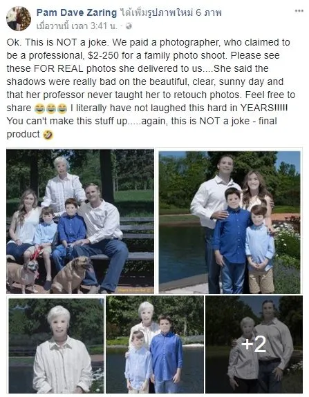 เรียกได้ว่าเป็นอีกหนึ่งเรื่องราวที่เคยถูกพูดถึงอย่างมากบนโลกออนไลน์ เมื่อผู้ใช้เฟซบุ๊ก Pam Dave Zaring ได้โพสต์เรื่องราวสุดช็อก เมื่อเธอช่างภาพที่อ้างว่าเป็นมืออาชีพมาถ่ายรูปครอบครัว แต่ผลที่ได้ทำเอาเงิบ โดยช่างภาพได้อ้างว่าเงาในภาพมันดูแย่ จึงได้จัดการรีทัช ตกแต่งให้นิด ๆ หน่อย ๆ แต่รีทัชเสียจนไม่เหลือเค้าเดิม กลายเป็นประสบการณ์สุดฮาที่ลืมไม่ลงจริง ๆ