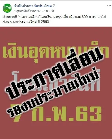 สืบเนื่องจากกรณีที่ก่อนหน้านี้มีประกาศจ่ายเงินอุดหนุนเด็ก ในวันที่ 7 กุมภาพันธ์ 2563 นี้ แต่ล่าสุดเมื่อวันที่ 3 กุมภาพันธ์ 2563 เพจ สำนักประชาสัมพันธ์เขต 7 ได้มีการโพสต์รูปภาพพร้อมทั้งระบุข้อความเอาไว้ว่า..