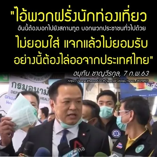 คำสัมภาษณ์ส่วนหนึ่งของ นายอนุทิน ชาญวีรกูล ติงคนที่ไม่รับแจกหน้ากากอนามัย ไม่สวมหน้ากากอนามัยในที่สาธารณะ ระหว่างลงพื้นที่แจกหน้ากากอนามัย ที่บริเวณสถานีรถไฟฟ้าบีทีเอส สถานีสยามวันนี้