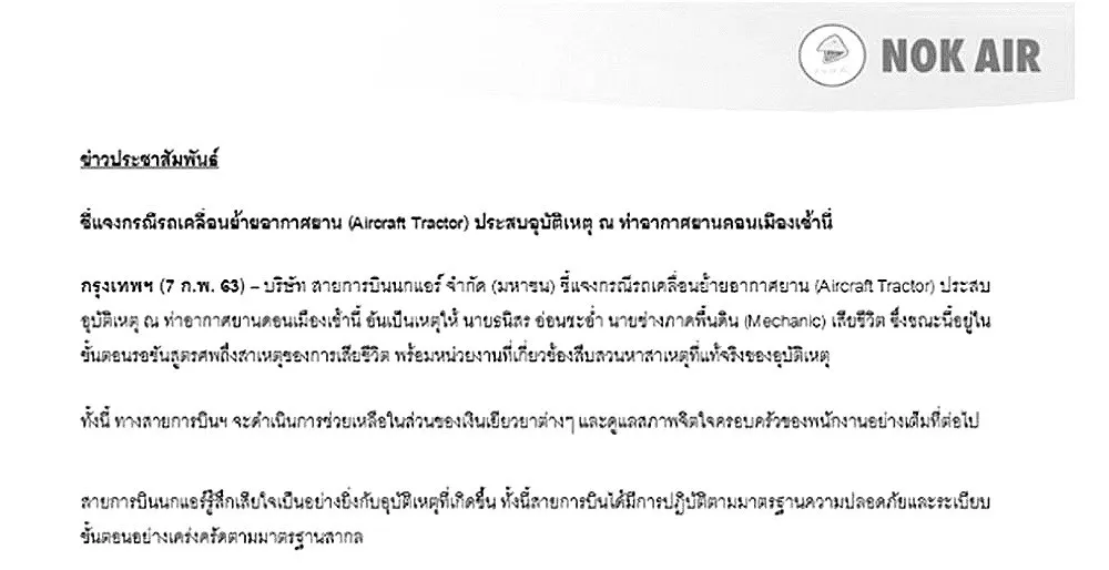 สำหรับผู้เสียชีวิตชื่อ นายธนิสร อ่อนชะอ่ำพนักงานช่างภาคพื้นดิน Mechanic บาดเจ็บสาหัสและได้เสียชีวิตในเวลาต่อมา หลังนำตัวส่งโรงพยาบาล ด้านสายการบินนกแอร์ พร้อมดำเนินการช่วยเหลือและชดเชยเยียวยาต่างๆ และดูแลสภาพจิตใจของครอบครัวเต็มที่ และรู้สึกเสียใจต่ออุบัติเหตุที่เกิดขึ้น