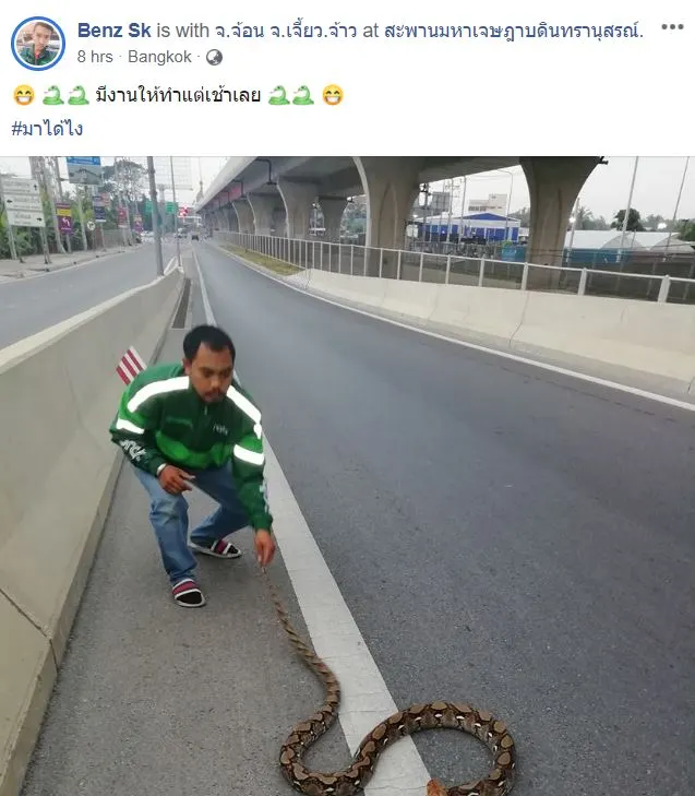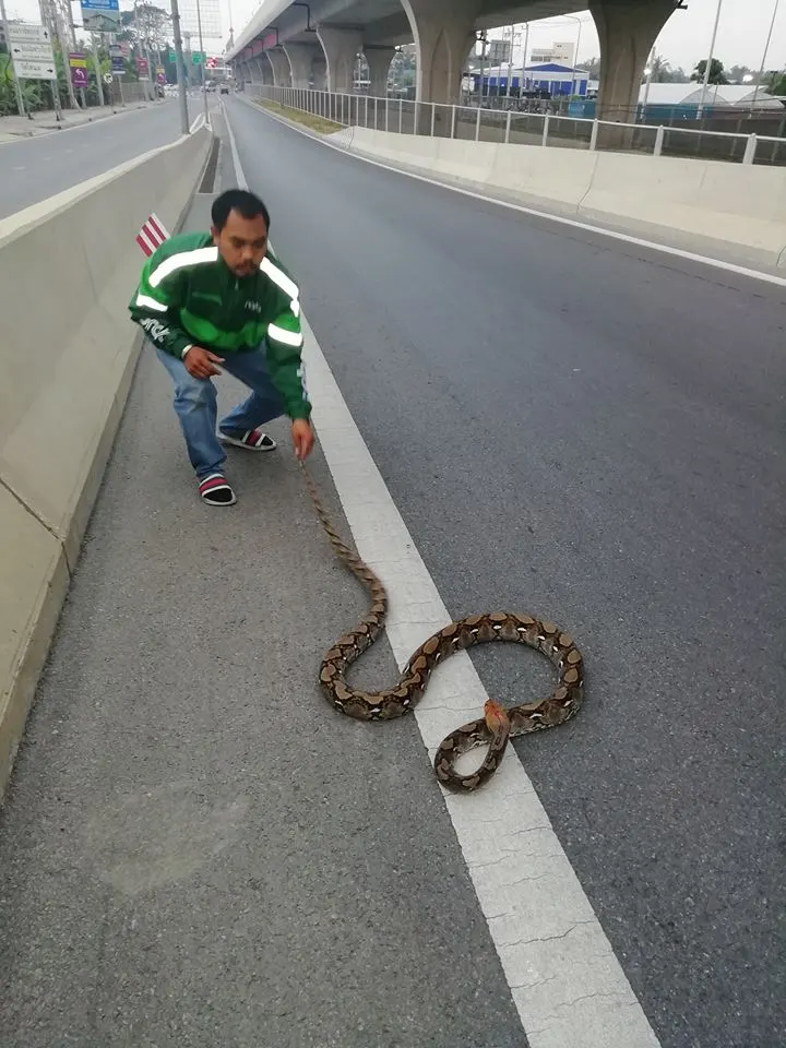 ซึ่งเจ้าตัวก็ไม่รอช้า ตัดสินใจจอดมอเตอร์ไซค์ ลงไปช่วยเอางูตัวใหญ่ลายสวยดังกล่าวพ้นจากถนน หวั่นเกิดอันตรายต่อตัวมันเอง รวมทั้งผู้ใช้รถใช้ถนนที่สัญจรผ่านไปมา อาจจะหักหลบ เบรคกะทันหันจนเกิดอุบัติเหตุขึ้นมาได้