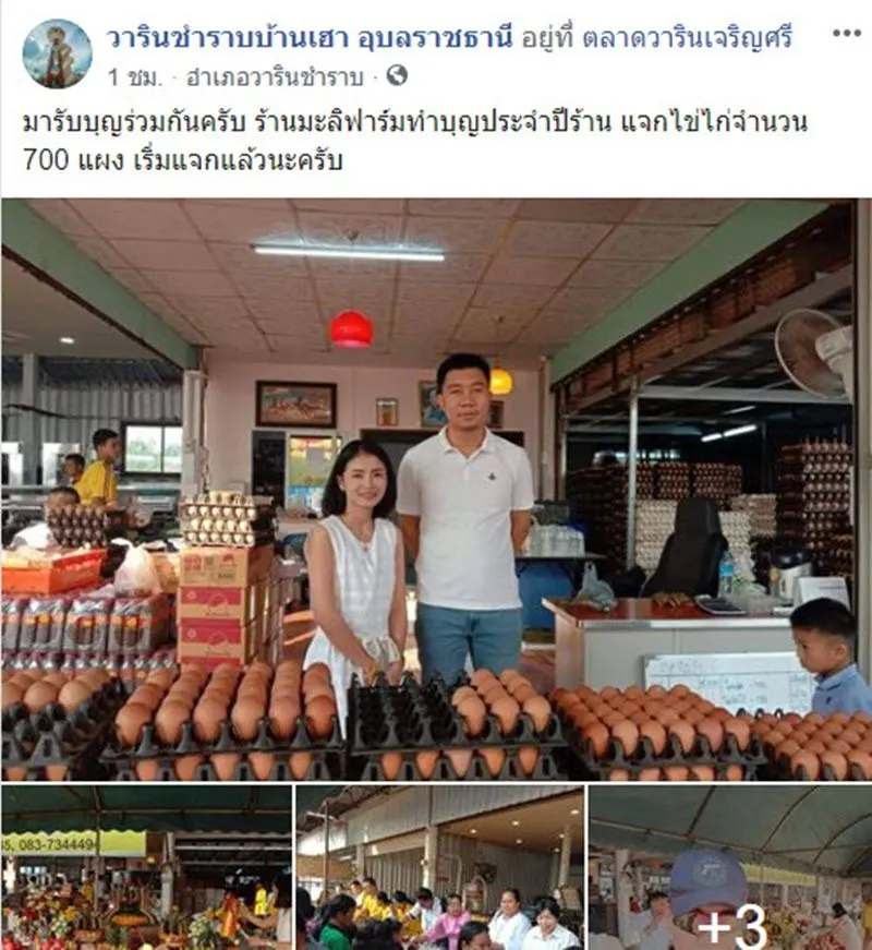 เป็นเรื่องราวดีๆ ที่น่าชื่นชมและเชิญชวนพี่น้องที่อยู่ใกล้ๆ เผื่อใครยังไม่ได้ข่าว สำหรับ ร้านมะลิฟาร์ม ที่ตลาดวารินเจริญศรี จังหวัดอุบลราชธานี ได้ทำบุญประจำปีร้าน ด้วยการแจกไข่ไก่จำนวน 700 แผง ก่อนที่จะเพิ่มเติมเป็น 1,000 แผงแล้ว แจกจ่ายทำบุญให้กับพี่แม่พี่น้องที่ผ่านไปมา โดยทางด้านเพจ วารินชำราบบ้านเฮา อุบลราชธานี ได้โพสต์แจ้งข่าวเรื่อวราวดีๆ นี้ โดยระบุว่า…