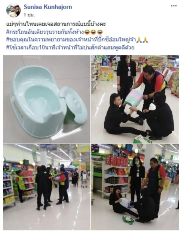 ผู้โพสต์ระบุข้อความว่า แม่ๆท่านไหนเคยเจอสถานการณ์แบบนี้บ้างคะ อันเดียววุ่นวายกันทั้งห้าง ขอบคุณในความพยายามของเจ้าหน้าที่ ใช้เวลาเกือบ 10 นาที เจ้าหน้าที่ไม่บ่นสักคำแถมพูดดีด้วย