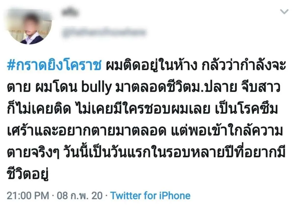 ล่าสุด หนุ่มน้อย ใช้ทวิตโพสต์ข้อความ ระบุว่า #กราดยิงโคราช ผมติดอยู่ในห้าง กลัวว่ากำลังจะตาย ผมโดน bully มาตลอดชีวิตม.ปลาย จีบสาวก็ไม่เคยติด ไม่เคยมีใครชอบผมเลย เป็นโรคซึมเศร้าและอยากตายมาตลอด แต่พอเข้าใกล้ความตายจริงๆ วันนี้เป็นวันแรกในรอบหลายปีที่อยากมีชีวิตอยู่