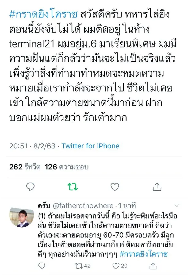 ล่าสุด มีการเปิดเผยโพสต์ของน้องม.6 คนหนึ่ง ซึ่งได้ทวีตข้อความผ่านทวิตเตอร์ว่า “สวัสดีครับทหารไล่ยิงตอนนี้ยังจับไม่ได้เพราะผมติดอยู่ในห้างเทอร์มินอล 21 ผมอยู่ม.6 มาเรียนพิเศษผมมีความฝันแต่ก็กลัวว่ามันจะไม่เป็นจริงแล้วเพิ่งรู้ว่าสิ่งที่ทำมาทั้งหมดจะหมดความหมายเมื่อเรากำลังจะจากไปชีวิตไม่เคยเข้าใกล้ความตายขนาดนี้มาก่อนฝากบอกแม่ผมด้วยว่าผมรักเขามาก