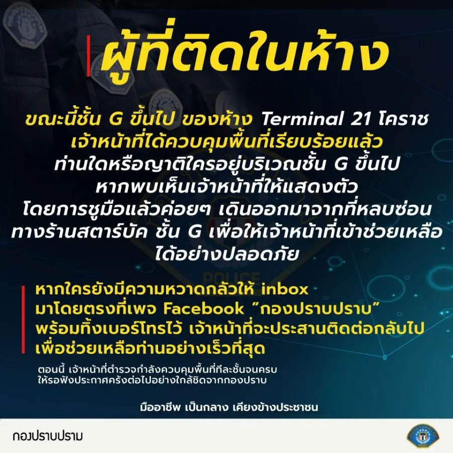 ขณะนี้ชั้น G ขึ้นไป ของห้าง Terminal 21 โคราช เจ้าหน้าที่ได้ควบคุมพื้นที่เรียบร้อยแล้ว ท่านใดหรือญาติใครอยู่บริเวณชั้น G ขึ้นไป