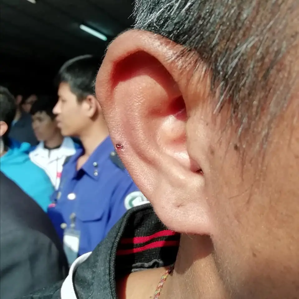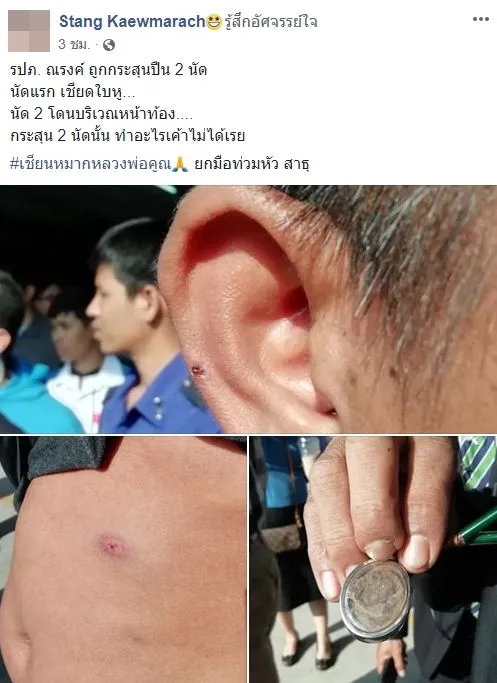 ผู้ใช้เฟซบุ๊กโพสต์ข้อความระบุว่า “รปภ. ณรงค์ ถูกกระสุนปืน 2 นัด นัดแรก เฉียดใบหู… นัด 2 โดนบริเวณหน้าท้อง…. กระสุน 2 นัดนั้น ทำอะไรเค้าไม่ได้เรย #เชียนหมากหลวงพ่อคูณ ยกมือท่วมหัว สาธุ”