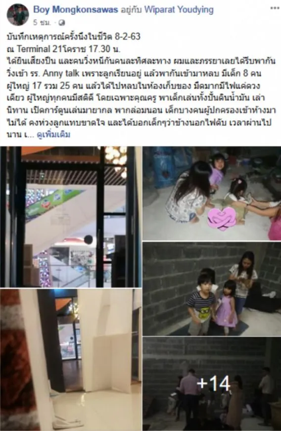 ได้ยินเสียงดังปัง และคนวิ่งหนีกันคนละทิศละทาง ผมและแฟนเลยได้รีบพากันวิ่งเข้า โรงเรียน Anny talk เพราะลูกเรียนอยู่ แล้วพากันเข้ามาหลบ มีเด็ก 8 คน ผู้ใหญ่ 17 รวม 25 คน แล้วได้ไปหลบในห้องเก็บของ มืดมากมีไฟแค่ดวงเดียว ผู้ใหญ่ทุกคนมีสติดี
