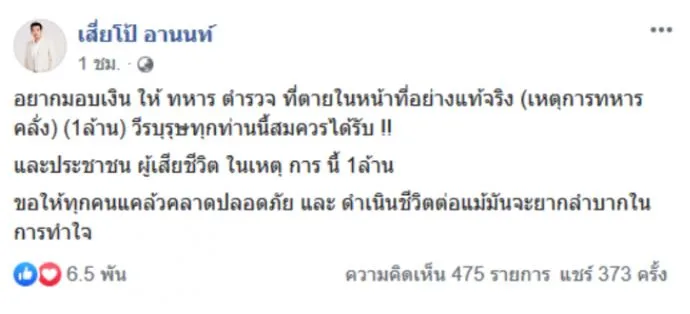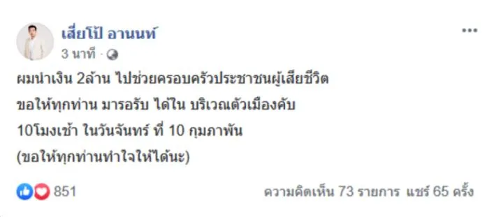เสี่ยโป้ อานนท์ ก็ได้ประกาศมอบเงิน ช่วย ถึงหลักล้าน