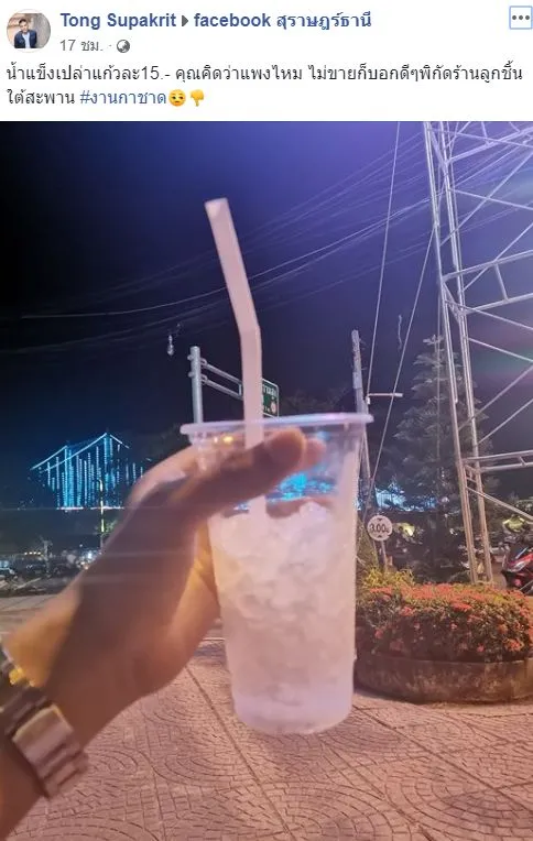 กลายเป็นเรื่องราวที่ถูกวิพากษ์วิจารณ์เป็นอย่างมากหลังเฟซบุ๊ก Tong Supakrit ออกมาโพสต์ภาพน้ำแข็งแก้วหนึ่งที่ซื้อในงานกาชาดประจำปีของจังหวัดสุราษฎร์ธานี ซึ่งจัดบริเวณริมเขื่อนแม่น้ำตาปีพร้อมข้อความระบุว่า… “น้ำแข็งเปล่าแก้วละ 15 บาท คุณคิดว่าแพงไหม ไม่ขายก็บอกดีๆ พิกัดร้านลูกชิ้นใต้สะพาน งานกาชาด ซึ่งหลังจากภาพดังกล่าวถูกโพสต์ออกไปได้มีชาวเน็ตเข้ามาแสดงความคิดเห็นเป็นอย่างมาก ต่อราคาของน้ำแข็งแก้วนี้ที่ต่างบอกว่าแพงไม่สมกับปริมาณที่ได้รับเป็นอย่างมาก