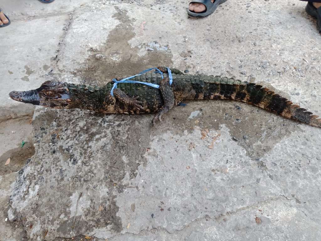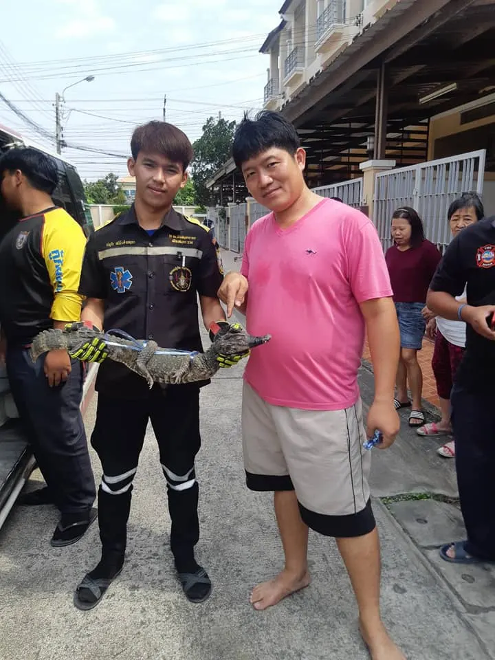 วันที่ 10 ก.พ.63 เจ้าหน้าที่ของสมาคมกู้ภัยสมุทรปราการ เข้าจับจระเข้ หรือเคย์เเมน ไม่ทราบเพศ ไม่ทราบสายพันธุ์ ลำตัวยาวจากปากถึงปลายางหาง ประมาณ 1 เมตร หลังรับแจ้งจากชาวบ้านภายในหมู่บ้านธนาภิรมย์ ตำบลบางเมือง อำเภอเมืองสมุทรปราการ ว่าพบจระเข้ตัวดังกล่าวหลบอยู่ใกล้กับกระถางต้นไม้บนถนนของหมู่บ้าน จึงช่วยกันจับมัดจระเข้ตัวดังกล่าวให้อยู่ในสภาพที่ปลอดภัย จากนั้นได้ประสานไปยังเจ้าหน้าที่รัฐที่เกี่ยวข้องให้มานำจระเข้ตัวนี้ไปตรวจสอบต่อไป ว่าเป็นจระเข้สายพันธุ์ไหน และมาอาศัยอยู่ในหมู่บ้านได้อย่างไร