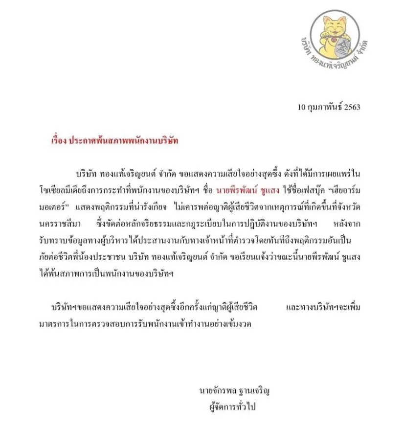 ล่าสุด บริษัท ทองแท้จริญยนต์ ที่ชายคนดังกล่าวได้ร่อนประกาศสำคัญแล้วว่า “บริษัท ทองแท้จริญยนต์ จำกัด ขอแสดงความเสียใจอย่างสุดซึ้ง ดังที่ได้มีการเผยแพร่ในโซเชียลมีเดียถึงการกระทำที่พนักงานของบริษัทฯ ชื่อ นายพีรพัฒน์ ชูแสง ใช้ชื่อเฟซบุ๊ก “เฮียอาร์ม มอเตอร์” แสดงฤติกรรมที่นรังเกียจ ไม่เคารพต่อญาติผู้เสียชีวิตจากเหตุการณ์ที่เกิดขึ้นที่จังหวัดนครราชสีมา ซึ่งขัดต่อหลักจริธรรมและกฎระเบียบในการปฏิบัติงานของบริษัทๆ
