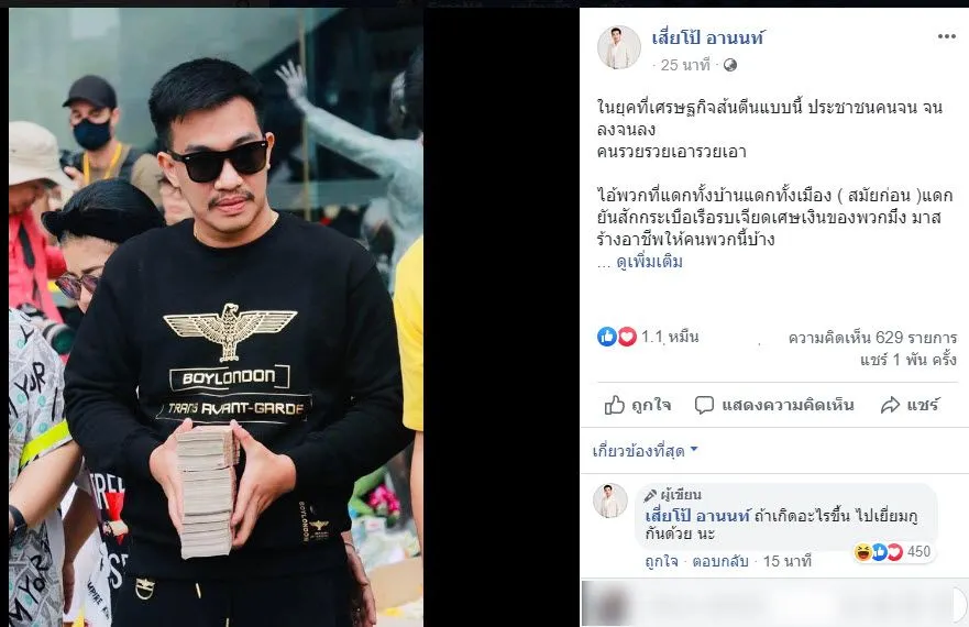 พร้อมกันนี้ยังได้อัดคลิป พร้อมกับทิ้งข้อความเอาไว้ว่า “ฝากแชถึงพวกคนรวย คนสีเทา” (คลิกเพื่อชมคลิป) กระทั่งล่าสุด เสี่ยโป้ ได้โพสต์ภาพ พร้อมระบุข้อคว่ามว่า “ในยุคที่เศรฐกิจส้นตีนแบบนี้ ประชาชนคนจน จนลงจนลง คนรวยรวยเอารวยเอา ไอ้พวกที่แ-กทั้งบ้านแ-กทั้งเมือง ( สมัยก่อน )แ-กยันสากกระเบือเรือรบเจียดเศษเงินของพวกมึง มาสร้างอาชีพให้คนพวกนี้บ้าง
