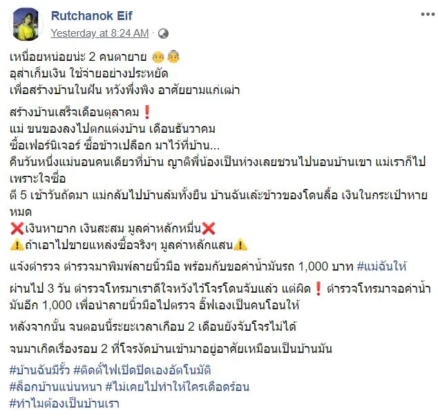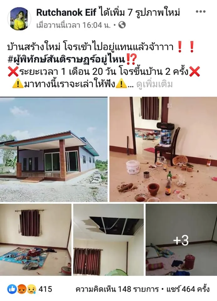 กรณีผู้ใช้เฟซบุ๊ค Rutchanok Eif ได้เผยเรื่องราวสุดช้ำ กับบ้านที่เพิ่งสร้างใหม่จอครอบครัว บ้านสร้างใหม่ โจรเข้าไปอยู่แทนแล้วจ้า ผู้พิทักษ์สันติราษฏร์อยู่ไหนระยะเวลา 1 เดือน 20 วัน โจรขึ้นบ้าน 2 ครั้ง ครอบครัวเราใช้เงินเก็บที่มีอยู่ มาสร้างบ้านในฝันของพ่อกับแม่ สร้างแบบไม่เป็นหนี้ ใช้เงินสะสมที่มี หมดไป 1,300,000 บาท ที่บ้านวังฮาง หนองหาน จ.อุดรธานี