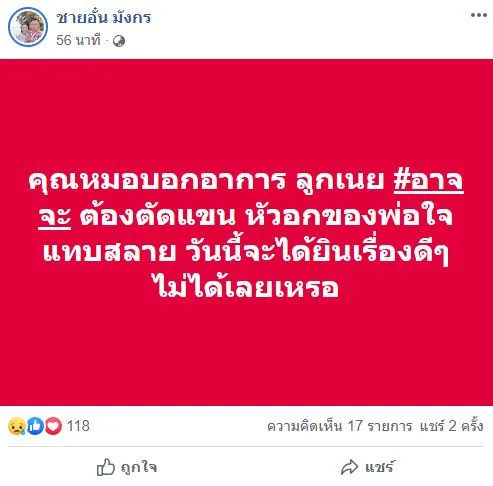 และล่าสุด เหมือนข่าวจากคุณหมอจะบีบหัวใจคนเป็นพ่อมากที่สุด จนต้องแจ้งข่าวผ่านเฟซบุ๊กของตัวเองอีกครั้งว่า “คุณหมอบอกอาการ ลูกเนย #อาจจะ ต้องตัดแขน หัวอกของพ่อใจแทบสลาย วันนี้จะได้ยินเรื่องดีๆ ไม่ได้เลยเหรอ”