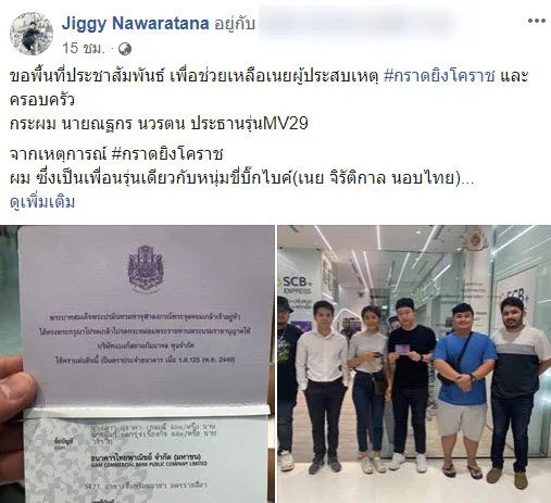 อย่างไรก็ตาม ในเฟซบุ๊ก Jiggy Nawaratana ได้โพสต์ประชาสัมพันธ์ว่า “ขอพื้นที่ประชาสัมพันธ์ เพื่อช่วยเหลือเนยผู้ประสบเหตุ #กราดยิงโคราช และครอบครัว