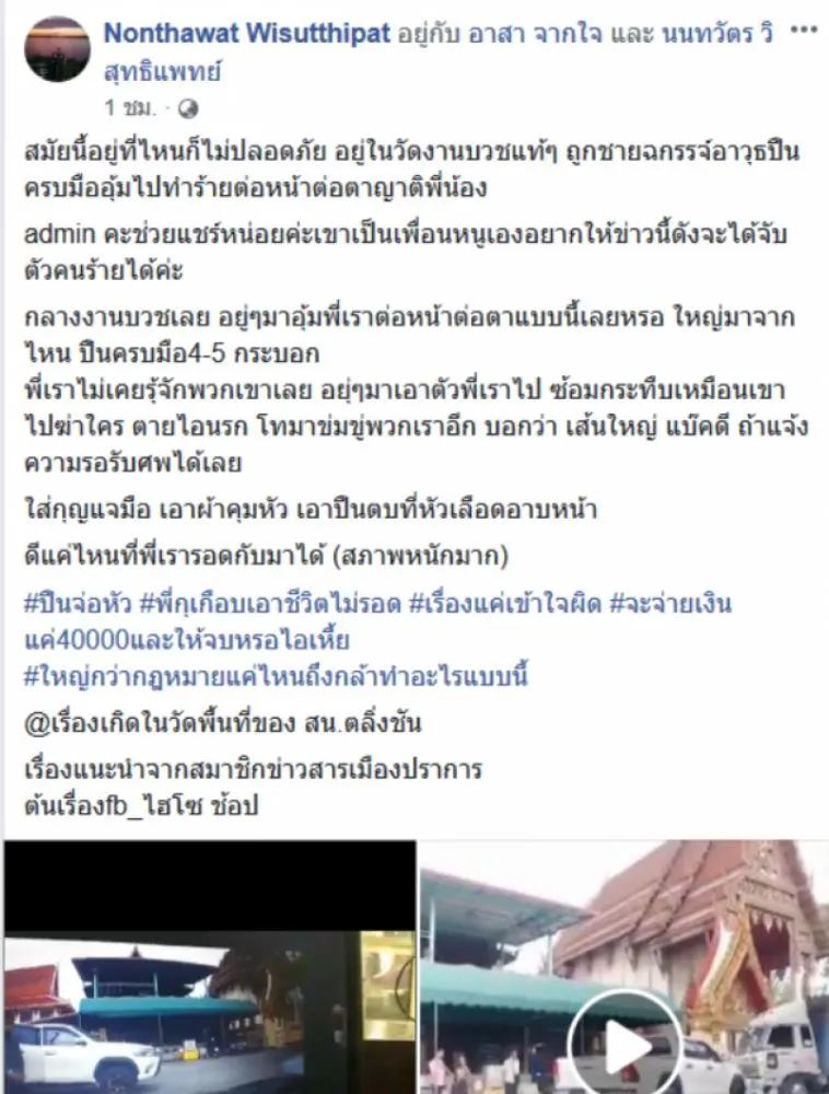 วันที่ 10 กุมภาพันธ์ 2563 ผู้สื่อข่าวสยามนิวส์รายงานว่า โลกออนไลน์มีการส่งต่อภาพเหตุการณ์ของผู้ใช้เฟซบุ๊กชื่อ Nonthawat Wisutthipat ซึ่งได้โพสต์คลิปเหตุการณ์น่ากลัวของกลุ่มคนพวกหนึ่งพร้อมระบุข้อความว่า สมัยนี้อยู่ที่ไหนก็ไม่ปลอดภัย อยู่ในวัดงานบวชแท้ๆ ถูกชายฉกรรจ์อาวุธปืนครบมืออุ้มไปทำร้ายต่อหน้าต่อตาญาติพี่น้อง admin คะช่วยแชร์หน่อยค่ะเขาเป็นเพื่อนหนูเองอยากให้ข่าวนี้ดังจะได้จับตัวคนร้ายได้ค่ะ